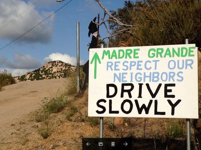 From San Diego: Madre Grande is located about 36 miles from downtown San Diego. Take Highway 94 East through Spring Valley, past the point where the Freeway ends and turns into a surface road. Watch for the right turn at the traffic light about a quarter mile past Jamacha Rd. Continue on Highway 94 through Jamul and Dulzura. Travel 2.7 miles past Dulzura Cafe and turn left onto Lucky Six Truck Trail, a slightly tricky turn onto a dirt road. Look for our address sign "Madre Grande 2260" (as well as a sign for "Mottola Ranch"). Mindfully drive 2.2 miles up the rocky rough road and through the gate that marks Mottola Ranch. Respect our neighbors and drive slowly, and leave gates as you find them (open if they were open, close them if they were closed.) You will soon arrive at two closed gates. Madre Grande is on the left, and the gate is not locked. Speed limit on all roads after Mottola gate is less than 10 miles an hour. Children, live stock, and wildlife are using the roads, so please drive carefully and respectfully.